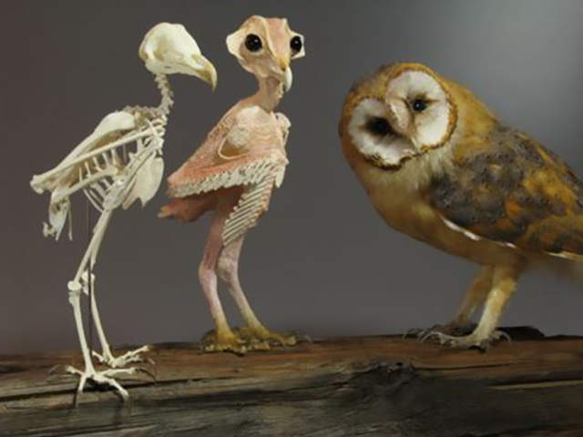 左边的是猫头鹰的骨骼,中间的是猫头鹰没有羽毛的样子,右边的是正常的猫头鹰。▼