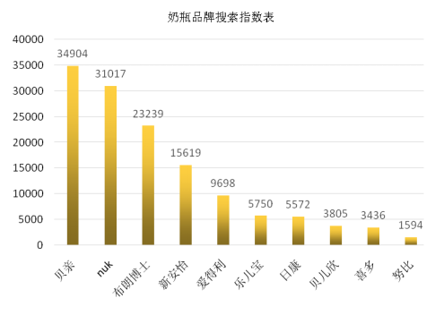 奶瓶龙头老大的位置不仅仅体现在市场份额的占有量上,网络整体搜索指数的居高不下也足以说明。贝亲、nuk、新安怡的网络搜索量分别达到了34904、31017和15619次,搜索频次远远超过了国产品牌。除此外,布朗博士作为国外品牌重要的一份子,也占据了排行榜第三的位置。