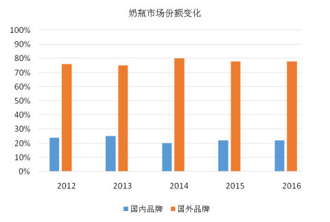 现今,国外品牌几乎垄断了中国的奶瓶市场。据不完全统计,少数几个国外品牌作为国内市场的龙头老大,占据了70%以上的份额。而这其中又以nuk、贝亲和新安怡三个品牌为代表,成为国内奶瓶市场的风向标。