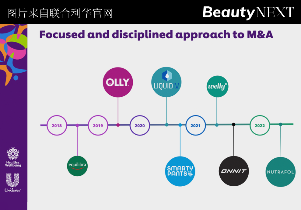 除资生堂外,多家美妆集团正通过收购布局大健康领域。以联合利华为例,2022年架构重组后,其专门设立了“美容与健康”(Health &Wellbeing)事业部。