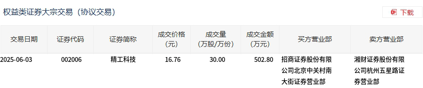 6月3日,精工科技大宗交易成交30万股,成交额502.8万元,占当日总成交额的4.12%,成交价16.76元,较市场收盘价16.76元持平。