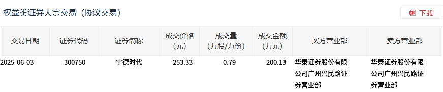 宁德时代今日大宗交易溢价成交7900股,成交额200.13万元