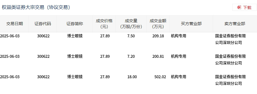 6月3日,博士眼镜大宗交易成交32.7万股,成交额912.01万元,占当日总成交额的4.46%,成交价27.89元,较市场收盘价30.45元折价8.41%。