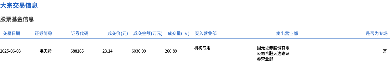 6月3日,埃夫特大宗交易成交260.89万股,成交额6036.99万元,占当日总成交额的19.11%,成交价23.14元,较市场收盘价23.47元折价1.41%。