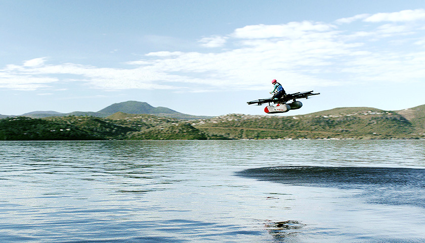 工程师卡梅隆·罗伯特森(Cameron Robertson)通过两根操纵杆驾驶着飞行车盘旋在湖面上空4.5米处,在飞行了约5分钟后,罗伯特森驾驶飞行车返回岸边。
