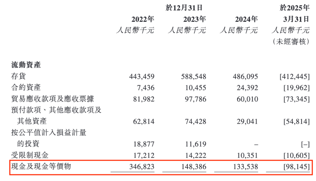 2024年,公司的现金储备为1.34亿元,已经低于其短期负债1.44亿元,资金缺口1000万元;到2025年3月31日,公司的现金储备已经降至9814.5万元,同期的短期负债则达到了1.48亿元,资金缺口扩大至约4986万元。