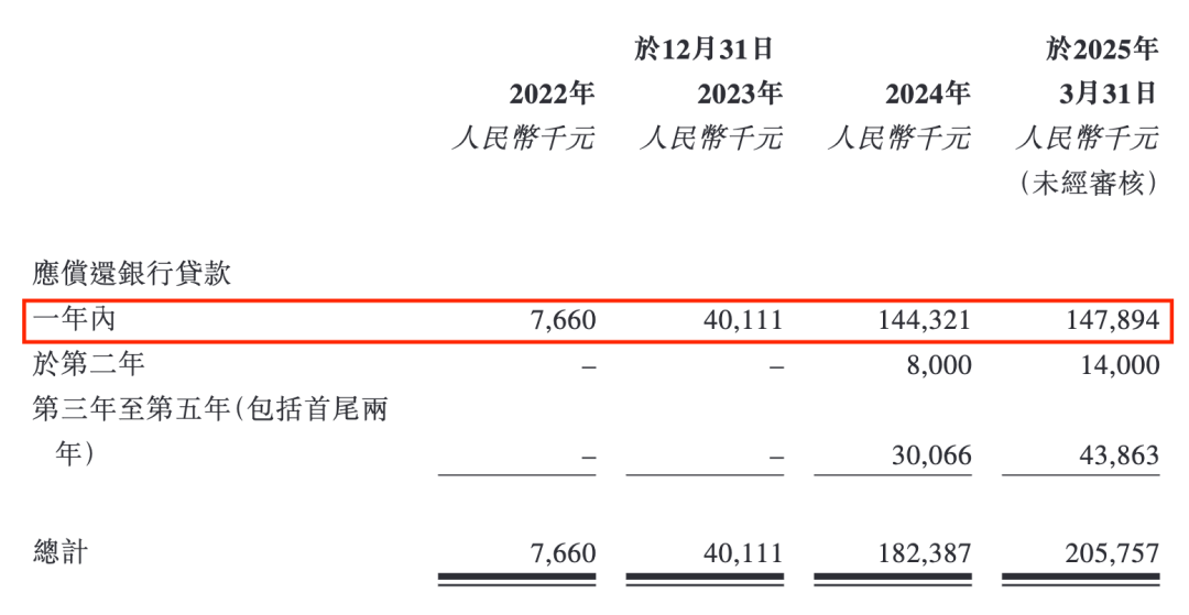2022年、2023年、2024年以及2025年第一季度,拓璞数控的一年内应偿还银行贷款数额分别为766万元、4011.1万元、1.44亿元和1.48亿元。