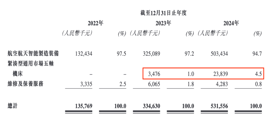 2023年下半年起,拓璞数控开始录得紧凑型通用市场五轴机床的销售收入,2023年和2024年的营收分别为347.6万元和2383.9万元,占比分别为1%和4.5%。