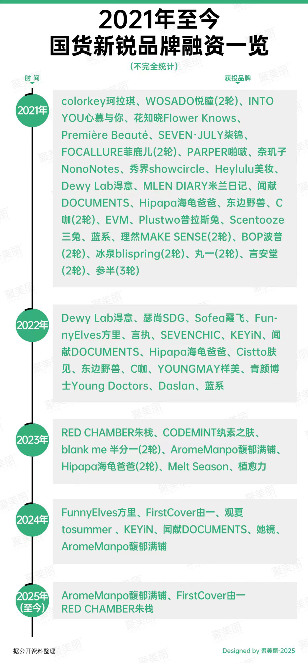 据不完全统计,在2021年获得投资人青睐的国货新锐不少于20个,2022年这一数量有所减少,2023年、2024年更是骤降至个位数,而2025年至今,新锐品牌仅有AromeManpo馥郁满铺、FirstCover由一、RED CHAMBER朱栈获投。