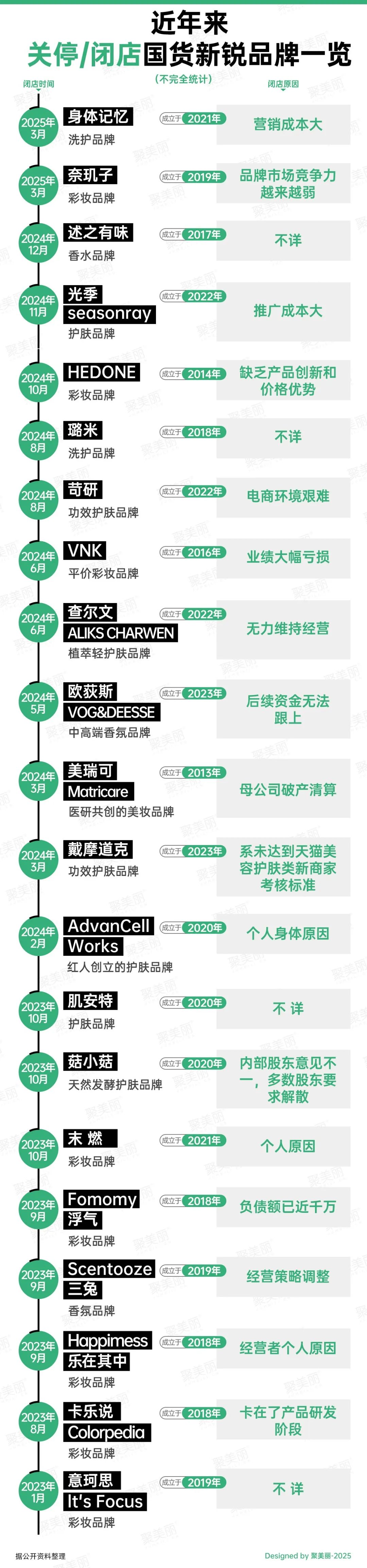 而当资本接连退场、融资断崖式下降,“倒闭魔咒”犹如一把“达摩克利斯之剑”悬在了新锐美妆品牌的头上,近年来因失去资本供血而闭店/关停的新锐美妆品牌不在少数。