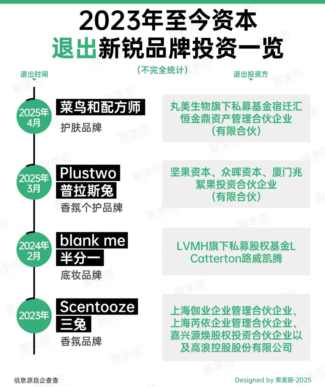 典型如,今年3月,坚果资本、众晖资本、厦门兆絮果投资合伙企业(有限合伙)出让香氛个护品牌Plustwo普拉斯兔所持股份给品牌创始团队;4月,丸美生物旗下私募基金宿迁汇恒金鼎资产管理合伙企业(有限合伙)退出护肤品牌菜鸟和配方师母公司杭州配方师科技股份有限公司的股东阵营。
