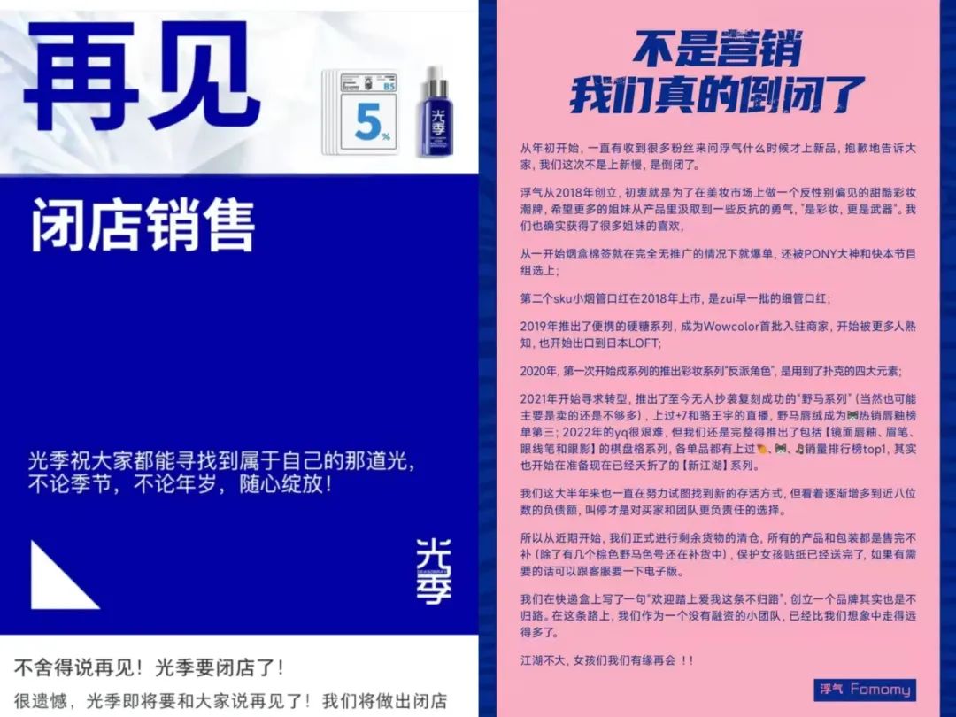 譬如,国货护肤品牌光季seasonray在小红书官方账号闭店推文中就曾表示,因为市场环境的变化,流量争夺激烈,光季目前已无法在推广上投入更多的资金了;本土彩妆品牌浮气Fomomy曾靠“野马系列”圈粉,但因过于依赖直播带货、缺乏持续IP运营,最终以近八位数的负债额宣告倒闭。
