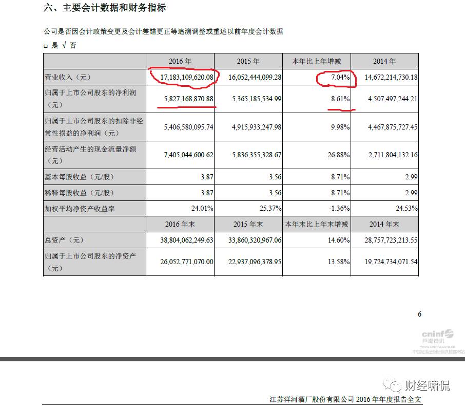 2016年,洋河股份营业收入实际增幅不过7%而已,与10%预期仍有较大差距,这可能就是洋河股份股价大跌的重要原因。