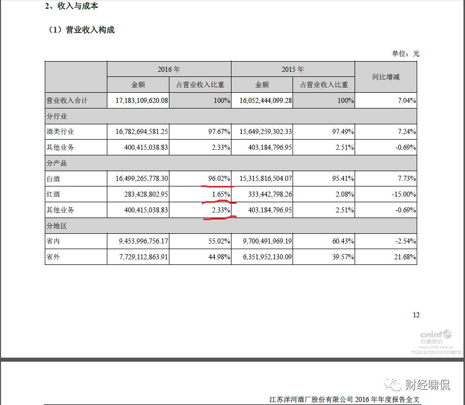 2016年,洋河股份的白酒、红酒和其他业务贡献的营业收入分别约为165亿、2.8亿和4亿元,占比各为96%、1.65%和2%左右;从收入构成上看,白酒业务在洋河股份收入版图中“一家独大”。