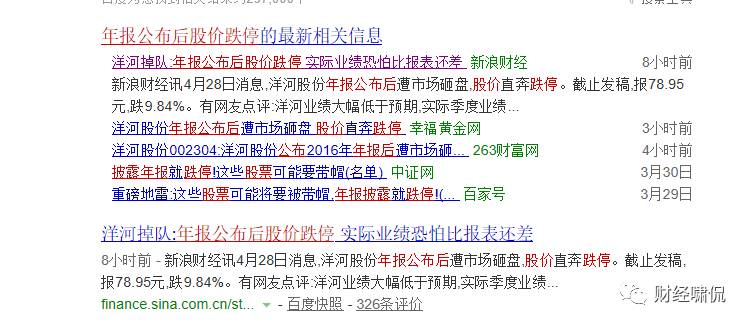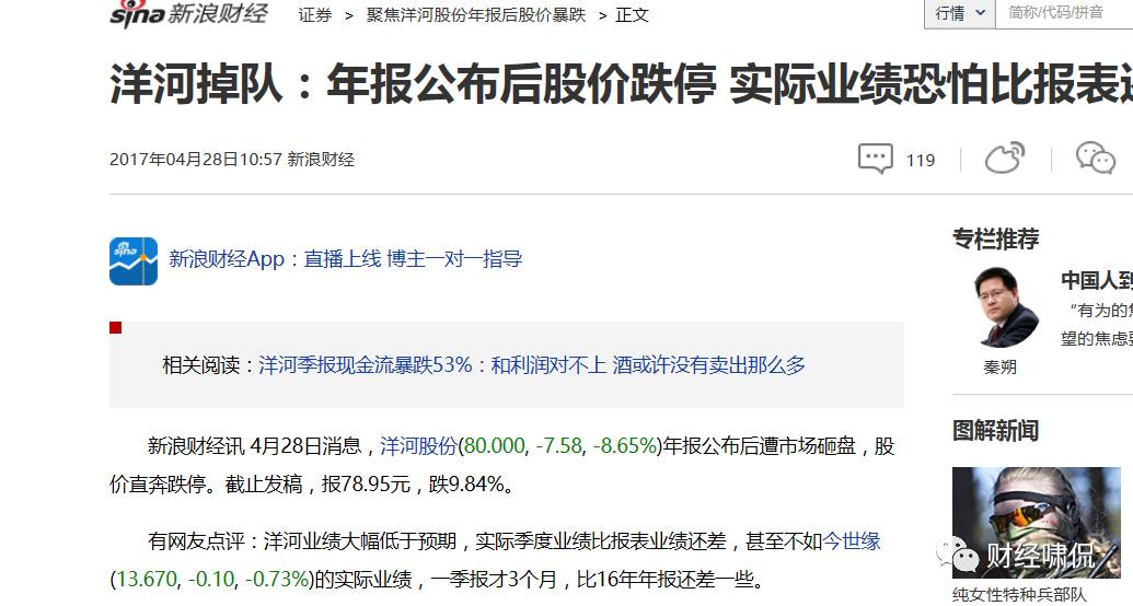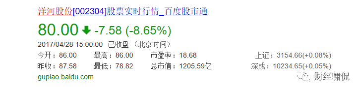 在公布2016年业绩当天即2017年4月28日,洋河股份的收盘价大跌7.58元/股,最终跌幅在8%以上,而盘中一度跌幅接近10%。