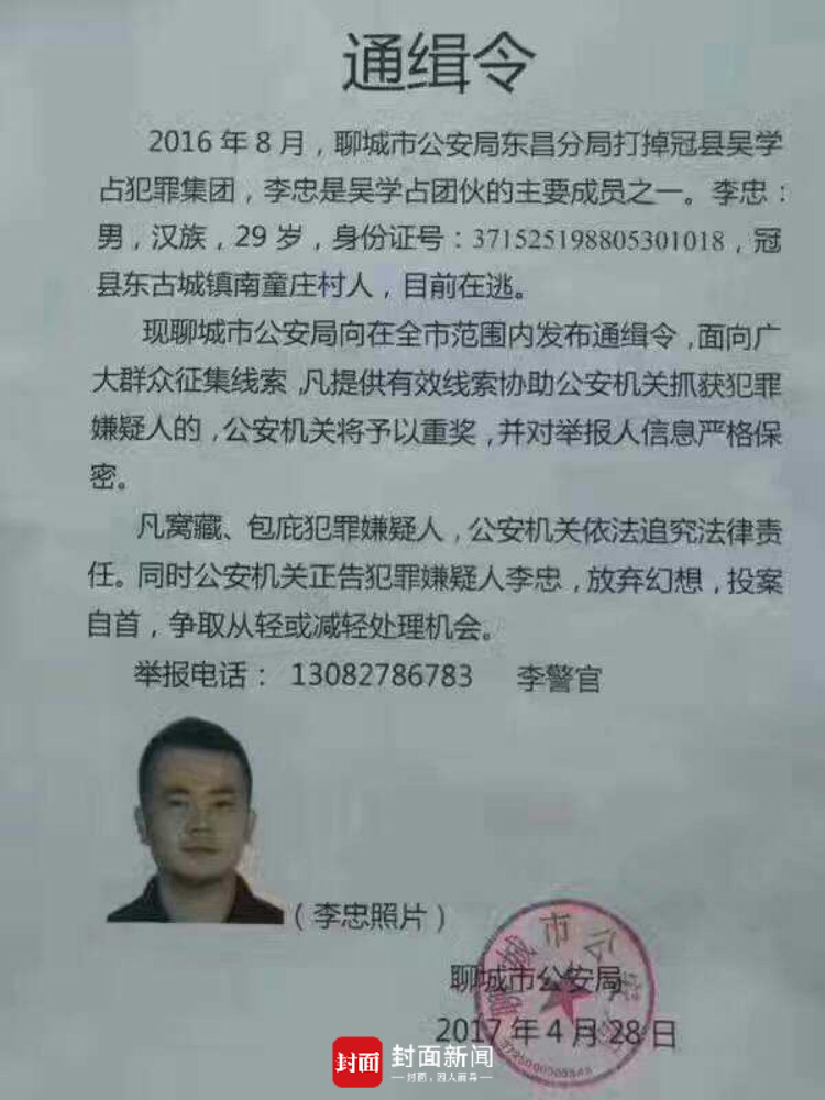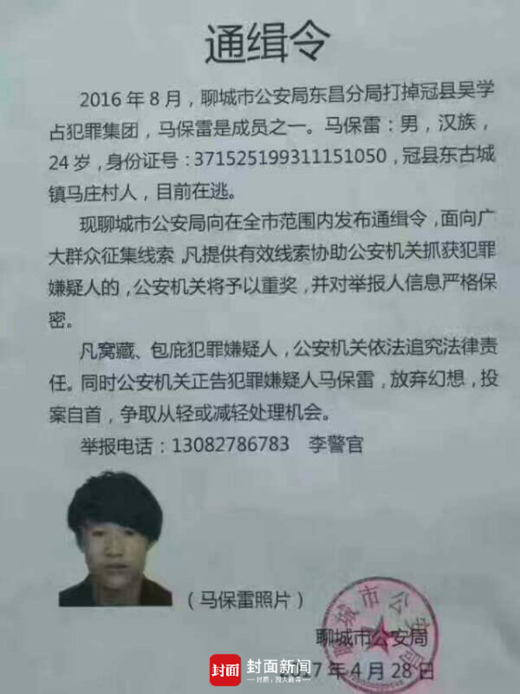 4月28日,山东聊城市公安局发布三道通缉令,面向广大群众征集线索,并督促在逃人员投案自首,争取从轻或减轻处理机会。