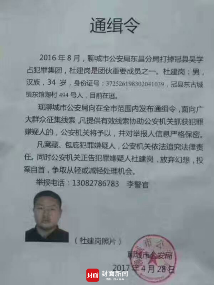 通缉令内容显示,2016年8月,聊城市公安局东昌分局打掉冠县吴学占犯罪集团。