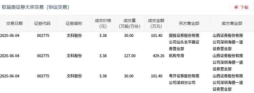 6月4日,文科股份大宗交易成交187万股,成交额632.06万元,占当日总成交额的20.9%,成交价3.38元,较市场收盘价3.8元折价11.05%。