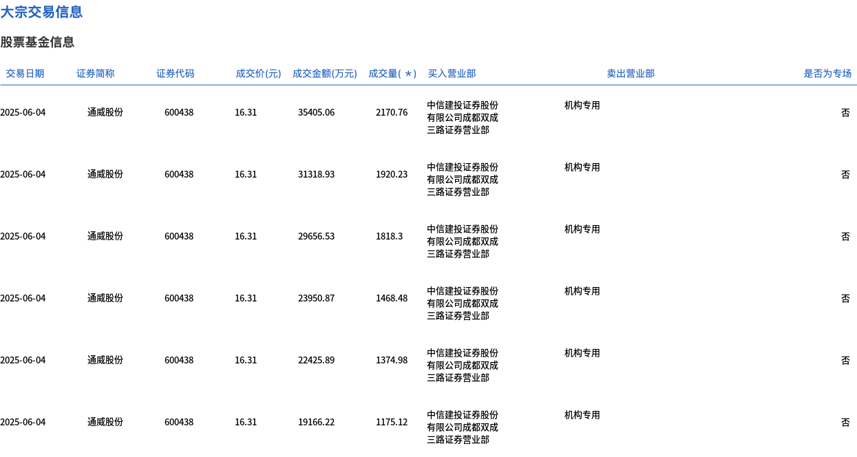 通威股份今日大宗交易平价成交9927.87万股,成交额16.19亿元