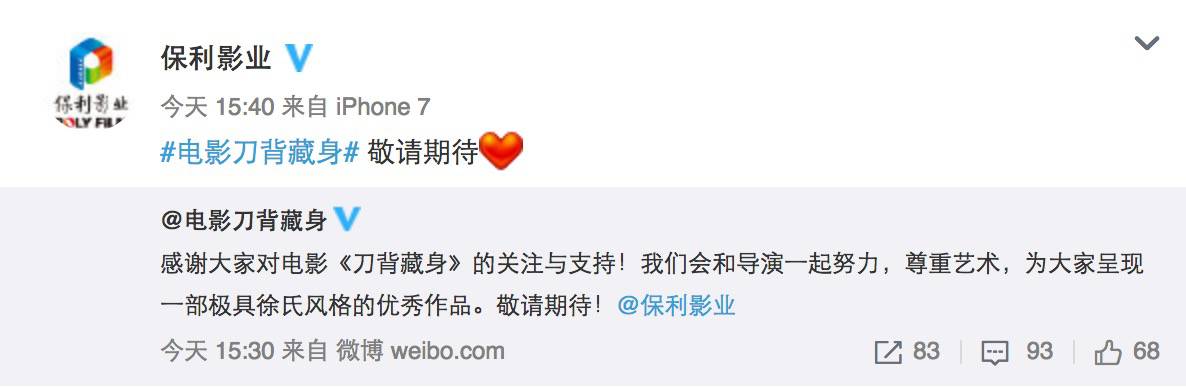 业内一片哗然之余,经由一天发酵,《刀背藏身》片方保利影业通过其微博表态,将尊重艺术,并和导演一起努力,为大家呈现一部极具徐氏风格的优秀作品,看起来事情出现了转机,不过实际情况远非这样简单!