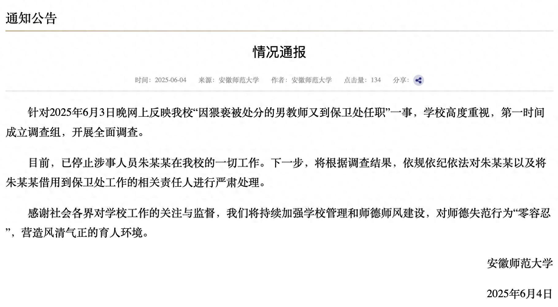 6月4日,安徽师范大学发布情况通报称,针对6月3日晚网上反映该校“因猥亵被处分的男教师又到保卫处任职”一事,学校高度重视,第一时间成立调查组,开展全面调查。目前,已停止涉事人员朱某某在该校的一切工作。下一步,将根据调查结果,依规依纪依法对朱某某以及将朱某某借用到保卫处工作的相关责任人进行严肃处理。