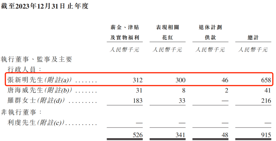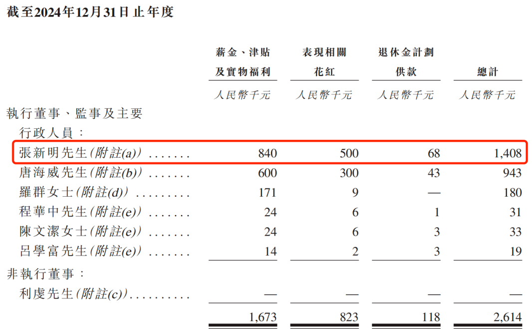 2023年,张新明获得的薪酬为65.8万元,包括薪酬、津贴和实物福利、表现相关花红、退休计划供款。到了2024年,张新明的薪酬涨至140.8万元,较2023年增长了113.98%。