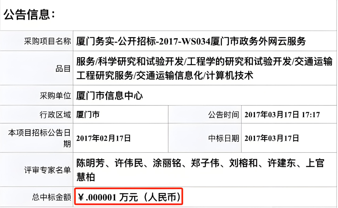 政务云市场上的混战中,价格底线也不断被击穿。2016年,温州市府办预算为100万的政府云平台项目,参与投标的中国移动以1元/月的价格中标;而一年后,腾讯云仅以0.01元中标厦门市政务外网云服务项目。