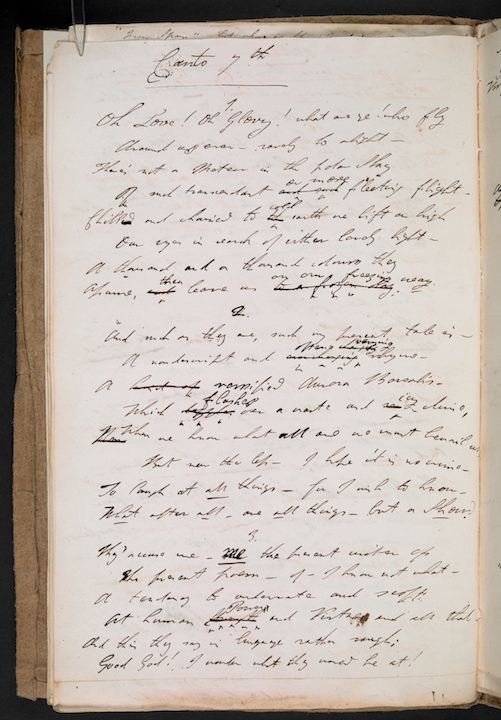 这首长约16000行、分为16章的讽刺长诗开始创作于1818年,但是直到拜伦于1824年去世时,也并没有完成。根据目前在国家图书馆《从莎士比亚到福尔摩斯:大英图书馆的珍宝》展览上展出的拜伦创作于1822年的第6、7章手稿,这些手稿被包裹并缝订在棕色的棉浆纸封皮里,从纸张的大小和水印中可以判断,拜伦使用的纸不止一个种类,书写所用的墨水也是根据不同配方制成的,手稿中有大量涂改的痕迹,纸张也有折痕。从这些细节都可以看出,诗人是在不同时间、不同环境下创作的这首诗,他当时很可能正处于一种颠沛流离的生活状况之中,没有固定的住所,经常在旅途中写作,并且写作的过程并非自然流泻、一蹴而就的,相反,这个过程可能是十分艰苦、充满着自我怀疑与否定的,即便是拜伦这样的少年天才也不例外。