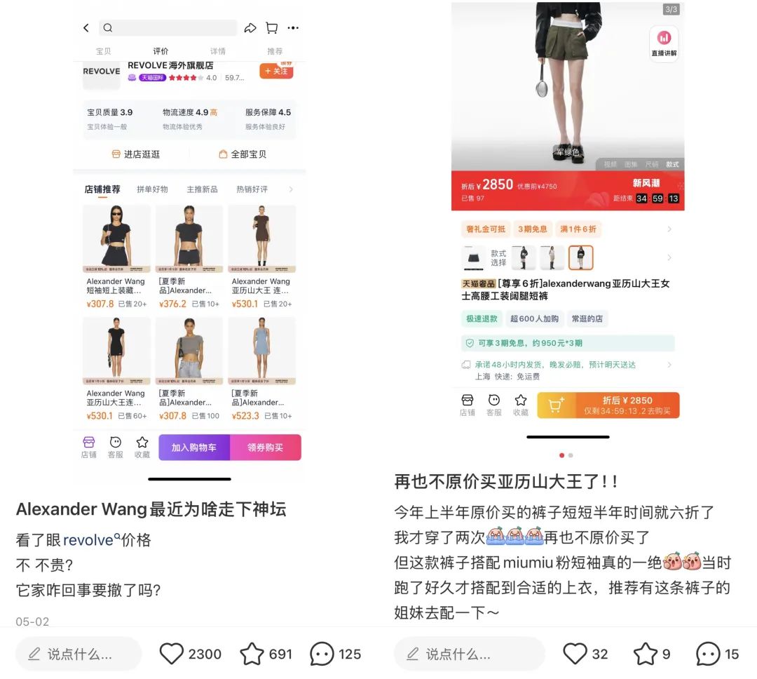 更典型的案例是Alexander Wang,其主线手袋曾是时尚圈的硬通货,定价动辄万元以上,称得上是跻身奢侈品牌之列。但现在你能在品牌电商平台的旗舰店里看到低至四折的标语、低至 200 元的T恤和内衣。即便这些原本就是定位更低价的副线产品,在折扣促销时也直接模糊了与主线的定位边界。当消费者看到折扣区和快时尚一样价格的副线服饰,再联想到专柜里售价上万的主线手袋,就在社交平台感叹:“大王这是走下神坛了。”而评论区里的吐槽也不少:“副线质量差太多”、“洗一次就变形”。