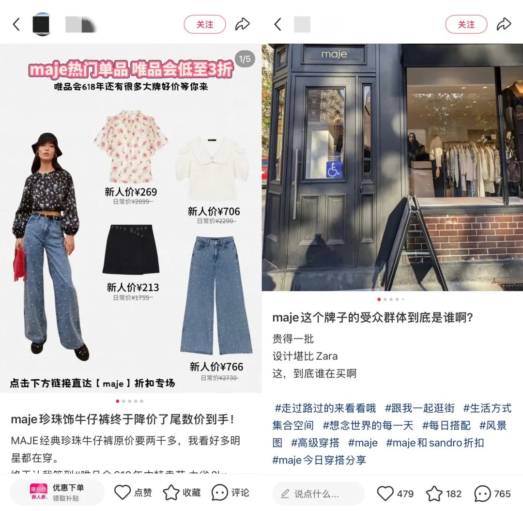 这种巨大的价格差异,直接打破了消费者对品牌的认知定位,更让消费者养成 “非折扣不消费” 的习惯。比如Maje、Sandro等不少千元的轻奢女装品牌,都被消费者调侃为 “平时不打折谁买”,小红书上蹲折扣、找仿款的攻略笔记数量更是产品种草的数倍。