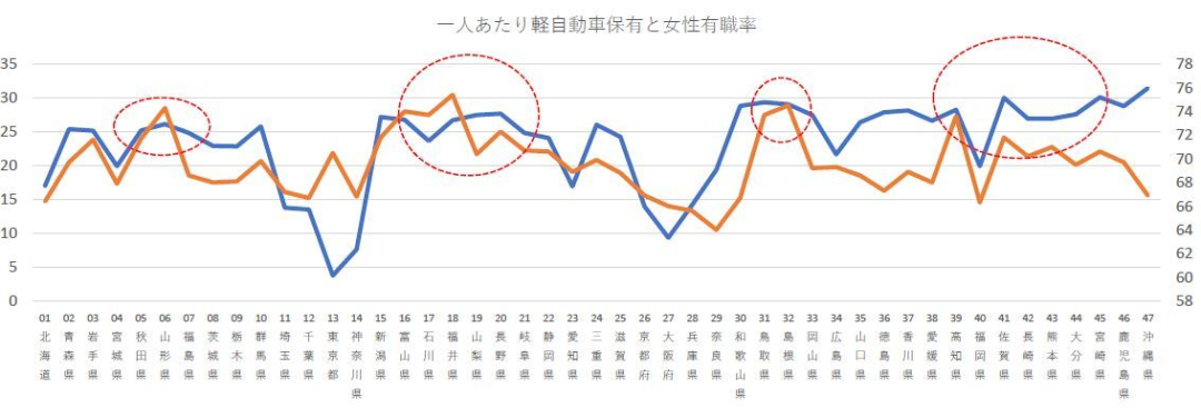 2017年日本各道府县女性就业人数的比例和人均微型车保有量(红圈所标为日本东北、北陆、山阴和九州的部分都道府县)图片来源:itmedia