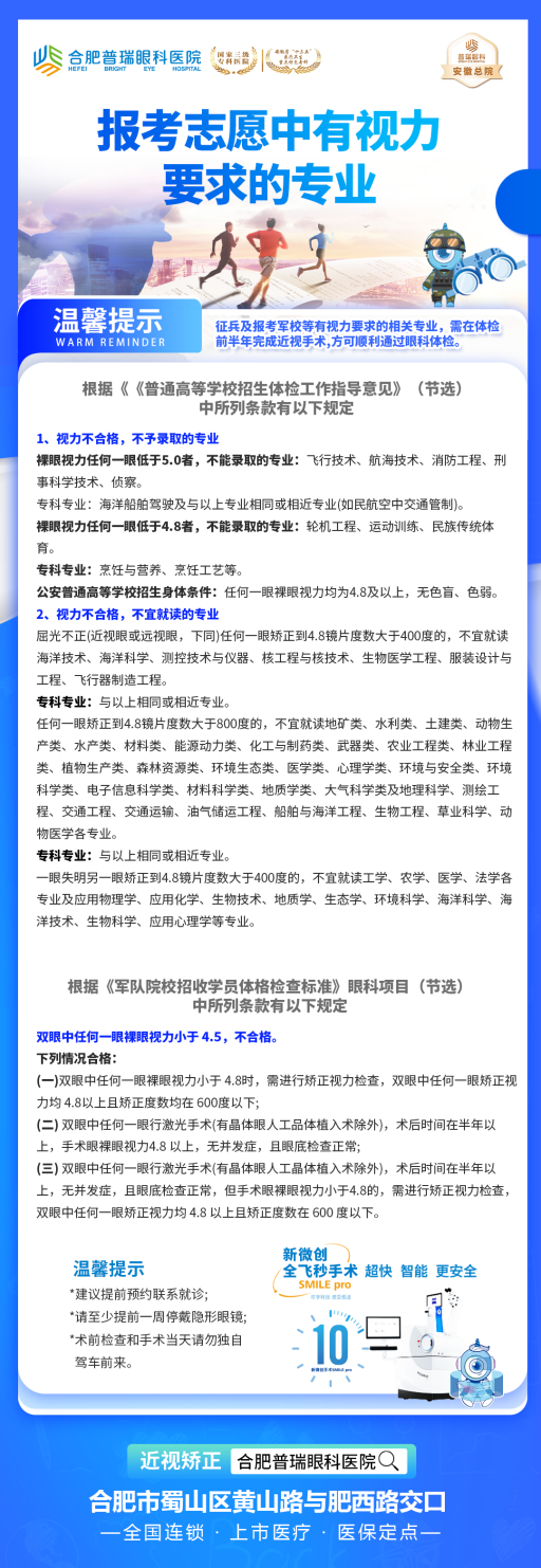 高考生及家长们一定要尽早了解,尽早准备!每年高考后都会迎来一波“摘镜潮”,准备做近视手术的考生,尤其是因择校或专业有视力要求的考生,为了不使报考受限,一般建议尽早进行术前检查,确认自己适不适合做近视手术,然后再合理安排手术及术后恢复时间,以免耽误体检及后续进程。避免因不适合手术或延期开展手术,而错失了就读理想院校或专业的机会。