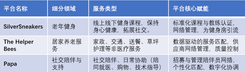 - 服务商:高度多样化且分散(如健身、居家护理、送餐、交通、社交陪伴等),管理难度大。