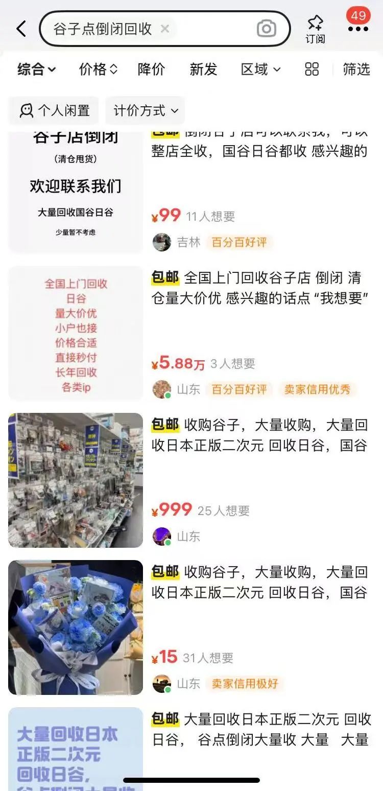 在全国范围内都有「闭店潮」出现,有个体谷店老板告诉我们,近期已经决定低价转让店铺及所有商品,及时止损。面向这类亏损店铺,抖音与闲鱼上出现了「回收库存」服务,熟悉情况的行业人士告诉我们,这些库存会被以极低价格转卖给门店,「有些谷子店还需要用这些滞销货来撑满货架」。