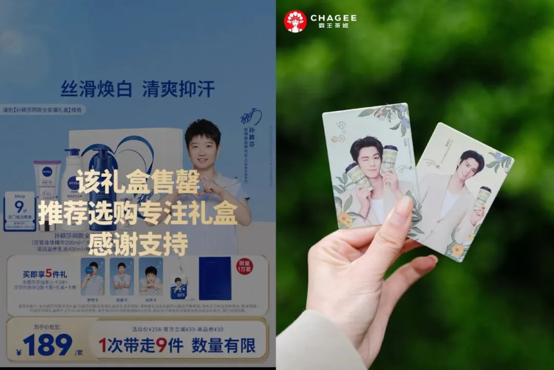 从形式来看,目前品牌多是以礼盒、套餐或明星同款搭配明星小卡进行售卖,又或者伴以抽奖、互动的方式,这使其不仅能够实现品牌传播,积累粉丝,也能获得不菲的营收回报。比如易烊千玺和瑞幸咖啡的相关联动(涉及小卡),微博话题达到上亿次阅读,讨论数达数十万,还有粉丝为收集小卡买下了四十杯饮品;最近妮维雅和国乒运动员孙颖莎合作推出了包含小卡在内的联名礼盒,淘宝数据显示,售价189元的礼盒产品已经售罄,包含单款身体乳和更高价礼盒在内的商品链接的总销量超过6万。这足以看出明星小卡的强大吸引力,粉丝的购买热情和消费实力让人不得不惊叹。