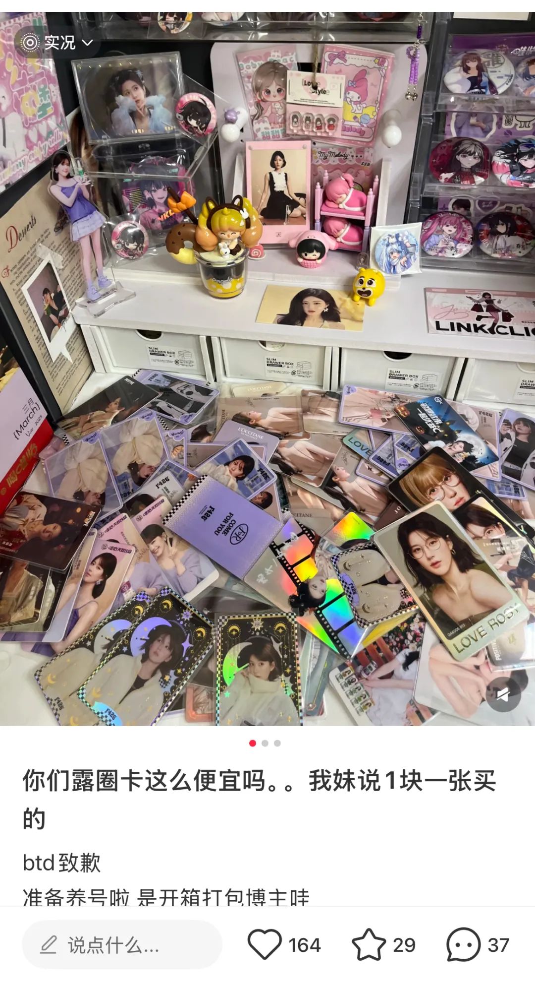 第四,作为“社交货币”,收藏明星小卡也可以彰显自己的喜好、品味,同时有机会结识到更多同担(喜欢同一个角色的粉丝),大家可以一起聊天、追星、以及购买周边并进行交流,这让买小卡的幸福翻倍。