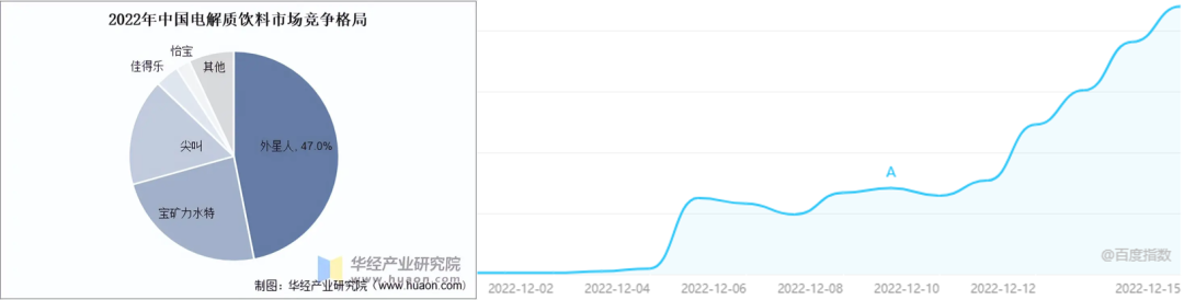 百度指数显示,自2022年12月4日起,电解质水的搜索指数暴涨,整体同比增长2000%以上。在京东平台饮料销售榜单中,销量前四名中的三款产品都为电解质饮料。