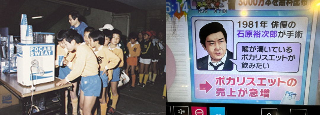 棒球场的运动员、桑拿房顾客、购物时大汗淋漓的家庭主妇等出汗人群都成为宝矿力免费送的目标用户,一年内送出3000万罐,覆盖当时约1/4日本人。在上市的第二年夏天,著名日星石原裕次郎在接受手术后,说道想喝宝矿力水特,借助名人效应和持续一年的推广,补水饮料的功能性理念终于被人们接受,宝矿力水特一炮走红。