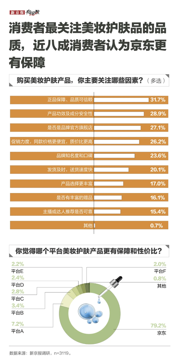 由于美妆护肤产品直接接触人体皮肤,消费者对其品质要求尤为突出。据新京报开展的618消费行为调研显示,正品保障、品质可信赖以31.7%的比例排在美妆消费者关注因素的首位。产品功效及成分安全性、是不是品牌官方旗舰店等因素也备受关注,反映出消费者在追求美的同时,更注重自身健康和权益。在选择购买平台时,近八成消费者认为京东的美妆护肤产品更具有品质保障。