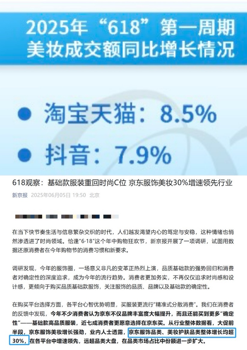 在此背景下,更具确定性的电商平台杀出重围,成为美妆增长的新高地。根据电商销售数据调研报告显示,今年1至4月,京东美妆整体双位数增长,增速在5、6月份进一步放大,618期间京东服饰品类、美妆护肤品类整体增长均超30%。