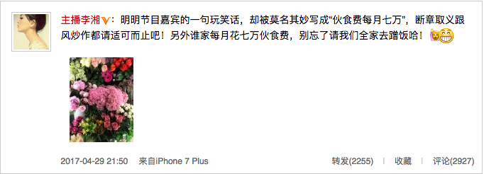 29日晚,李湘通过微博发声,微博写道:“明明节目嘉宾的一句玩笑话,却被莫名其妙写成‘伙食费每月七万’,断章取义跟风炒作都请适可而止吧!”正面否认每月花费巨额伙食费同时,另开玩笑道:“谁家每月花七万伙食费,别忘了请我们全家去蹭饭!”