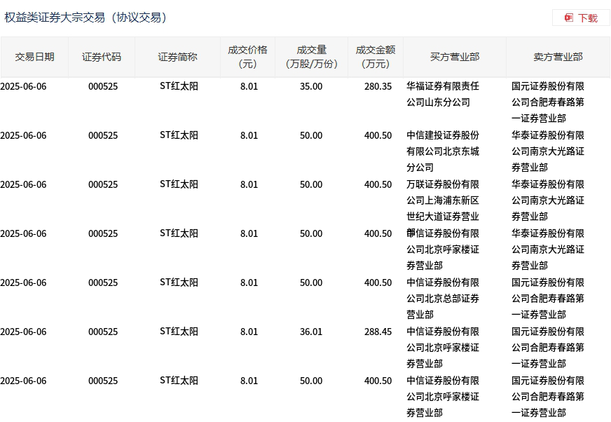 6月6日,ST红太阳大宗交易成交321.01万股,成交额2571.3万元,占当日总成交额的3.6%,成交价8.01元,较市场收盘价8.13元折价1.48%。