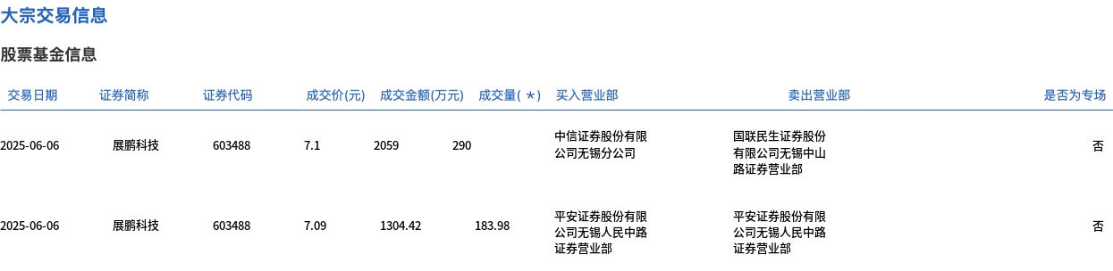 6月6日,展鹏科技大宗交易成交473.98万股,成交额3363.42万元,占当日总成交额的46.46%,成交均价7.1元,较市场收盘价7.93元折价10.52%,其中最高成交价7.1元,最低成交价7.09元。
