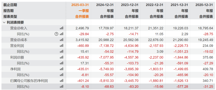 ST路通已经连亏四年,2021年-2024年净利润分别亏损0.15亿元、0.18亿元、0.37亿元、0.57亿元。2025年一季度,公司营收2946万元,同比下降29.84%;净利润亏损435万元,同比下降6.81%。