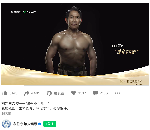 5月10日,该公众号发表一篇:刘先生75岁--“没有不可能!”的文章,文章内附有刘革新拍摄的广告宣传片,宣传片中刘革新赤膊上阵,展示饱满肌肉。视频画外音为:麦角硫因,生命长青。科伦永年,与您相伴!