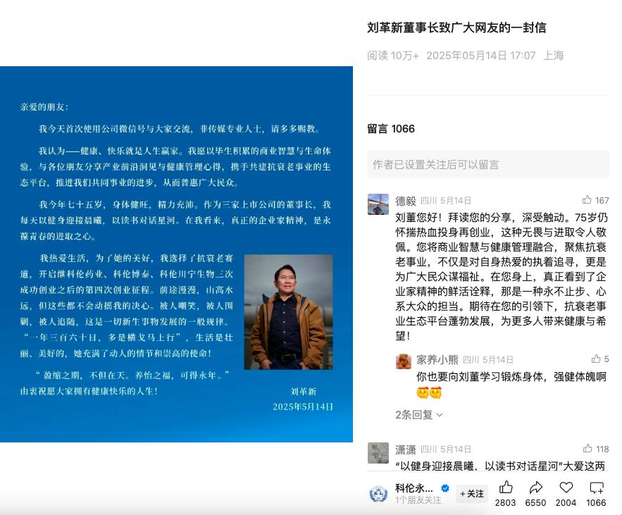 “我热爱生活,为了她的美好,我选择了抗衰老赛道,开启继科伦药业、科伦博泰、科伦川宁生物三次成功创业之后的第四次创业征程。”刘革新表示。该篇文章突破10万+阅读量,评论区一水儿的“支持”。