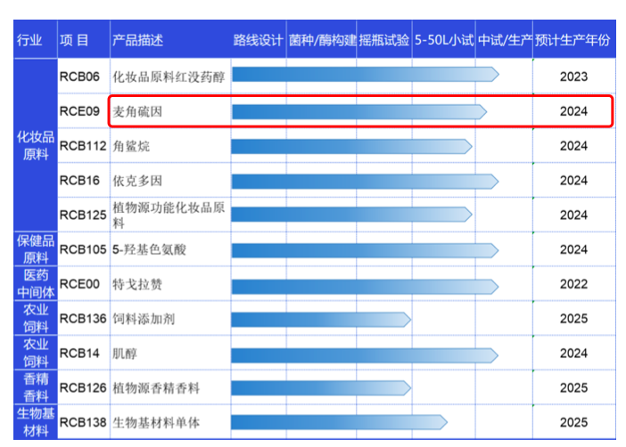 川宁生物早在2022年报中就提到,子公司锐康生物通过自主研发已向川宁生物交付了红没药醇、5-羟基色氨酸、麦角硫因等3个产品。麦角硫因等产品正在进行中试验证。