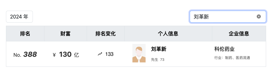 刘革新家族也在2019年以135亿元人民币财富登上《2019年胡润百富榜》,排名275名。到2024年财富值缩水至130亿元,排名388。