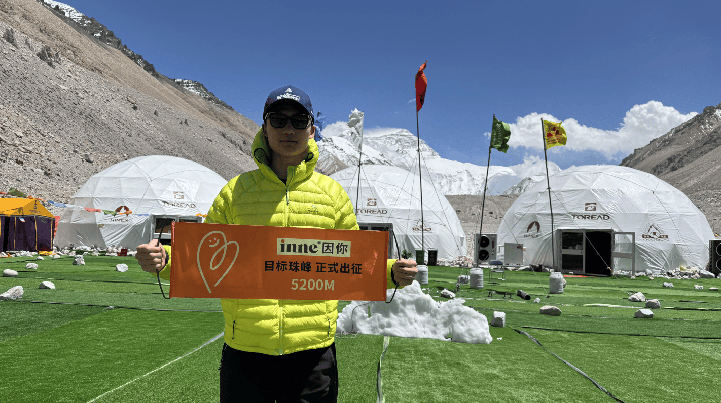 就在登山队正式向珠峰发起冲击前,inne®品牌还曾联合京东买药新越界,于海拔4300米的西藏珠穆朗玛峰岗嘎镇观景点,进行了一场震撼业界的巅峰直播。以雪山为背景,以冰川为讲台,inne®因你邀请队长那木错做客直播间,向观众详细解析了少年登顶珠峰所需的专业素养与面临的极限挑战,并展示两款与游美青少年登山队联合推出的inne®珠峰定制礼盒。