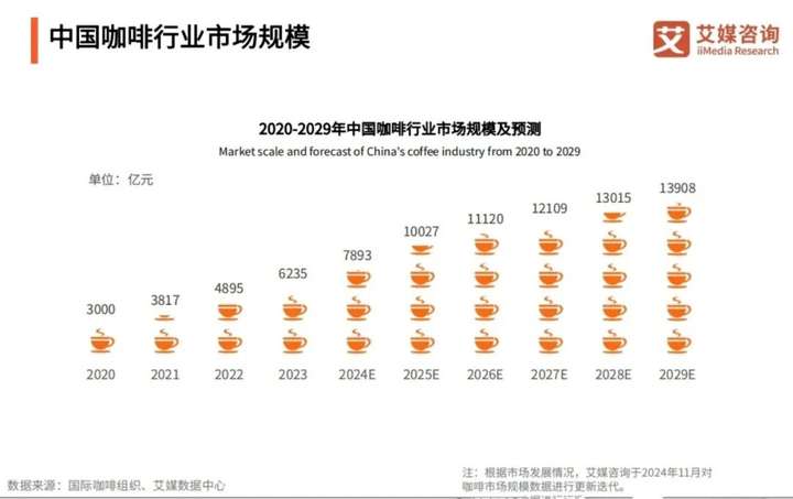 过去几年,中国咖啡行业市场规模持续增长,艾媒咨询数据显示,2023年市场规模高达6200亿元,预计2025年将突破万亿元大关。